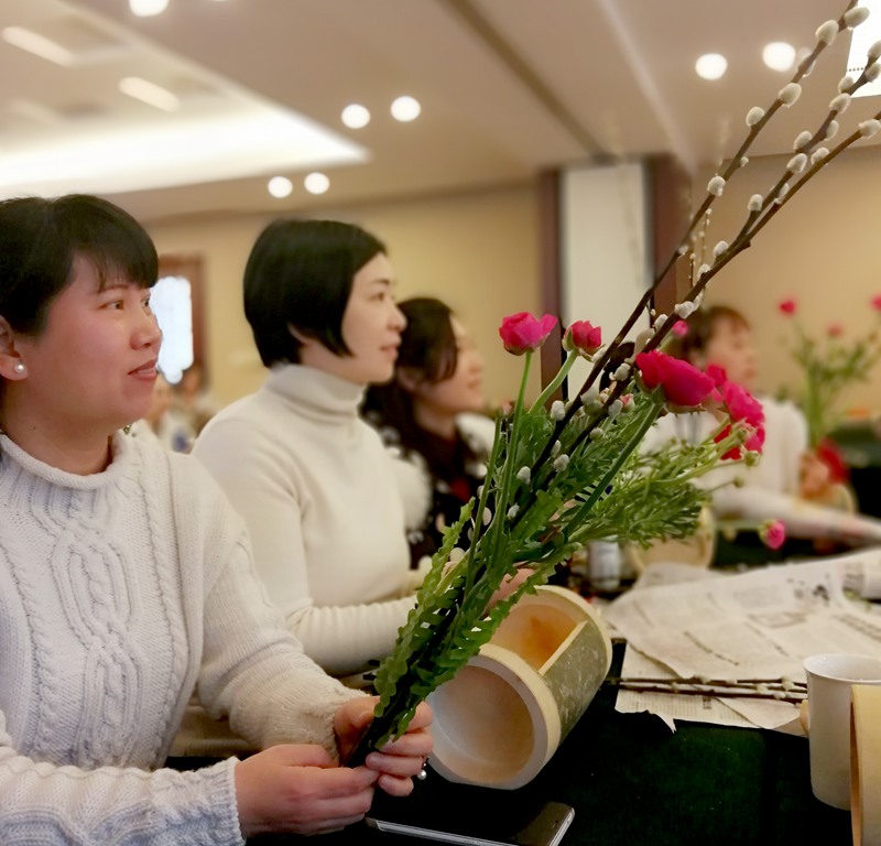 首先(xian)是(shi)理(li)論課(ke)的(de)學(xue)習,老師向(xiang)我們娓娓講述花(hua)(hua)道(dao)的(de)歷史,花(hua)(hua)的(de)盛(sheng)放(fang)、含苞、凋謝,寓示四季(ji)的(de)輪回和生(sheng)(sheng)命的(de)不同階段,介紹了(le)幾(ji)種不同的(de)流派(pai)和風格(ge):茶花(hua)(hua)、立(li)花(hua)(hua)、生(sheng)(sheng)花(hua)(hua)、盛(sheng)花(hua)(hua)、自(zi)由(you)花(hua)(hua)。一葉(xie)式生(sheng)(sheng)花(hua)(hua)的(de)風格(ge)是(shi)現代花(hua)(hua)道(dao),特點(dian)是(shi)注重(zhong)創造(zao),崇尚自(zi)然(ran)美,發掘植物(wu)在自(zi)然(ran)中的(de)美與生(sheng)(sheng)命力。她說,完美的(de)花(hua)(hua)道(dao)作品應該是(shi)每個(ge)人對大(da)自(zi)然(ran)個(ge)性(xing)理(li)解的(de)表達。結合歷年(nian)花(hua)(hua)道(dao)展上作品投(tou)影(ying),對花(hua)(hua)道(dao)作品有了(le)更直觀、感(gan)性(xing)認識。老師以獨(du)到的(de)思考、清逸(yi)靈動的(de)語言,賦予(yu)植物(wu)豐(feng)富的(de)文化(hua)內涵和生(sheng)(sheng)命啟示,讓我們在繁忙的(de)生(sheng)(sheng)活中,放(fang)慢腳步,悠然(ran)欣賞目(mu)之所(suo)及、俯拾即是(shi)的(de)自(zi)然(ran)之美與人生(sheng)(sheng)詩(shi)意(yi),既(ji)陶冶(ye)性(xing)情,又(you)培養(yang)情趣。